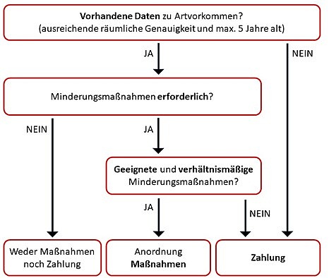 Liegen den soeben dargestellten Anforderungen entsprechende Daten vor, hat die Behörde auf Grundlage dieser Daten zunächst zu prüfen, ob Minderungsmaßnahmen erforderlich sind. Ist das nicht der Fall, bedarf es weder entsprechender Maßnahmen noch einer Zahlung. Andernfalls sind geeignete und verhältnismäßige Minderungsmaßnahmen anzuordnen. Fehlt es an geeigneten und/oder verhältnismäßigen Maßnahmen, so ist eine Zahlung zu leisten.